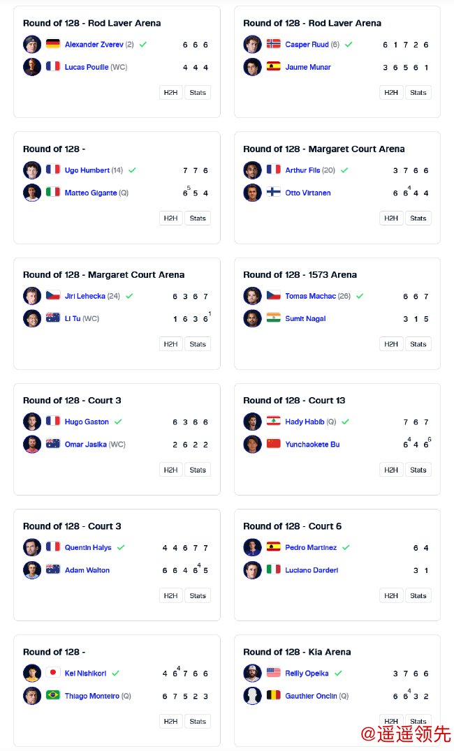 北京时间1月12日晚,2025澳大利亚网球公开赛结束正赛首日的争夺。由于雨水的缘故,当日男单比赛只进行了12场比赛。2号种子A·兹维列夫、6号种子鲁德、14号种子安贝尔、20号种子菲斯、24号种子莱赫卡和26号种子马哈奇都顺利闯过首轮关。